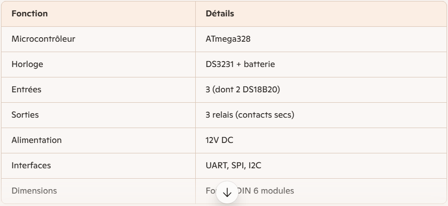 Elle se monte facilement sur un rail DIN (format 6 modules) et combine la puissance de l’ATmega328, la précision du DS3231 (horloge temps réel), et la simplicité d’un câblage direct via des borniers enfichables.